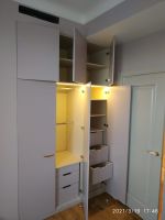 Лакированные или матовые фасады декорированы стильной фурнитурой с ненавязчивым дизайном: аккуратные профилированные или тонкие вертикальные ручки гармонично дополняют внешний вид шкафа, не акцентируя на себе внимание, а лишь подчеркивая современный характер конструкции.