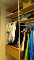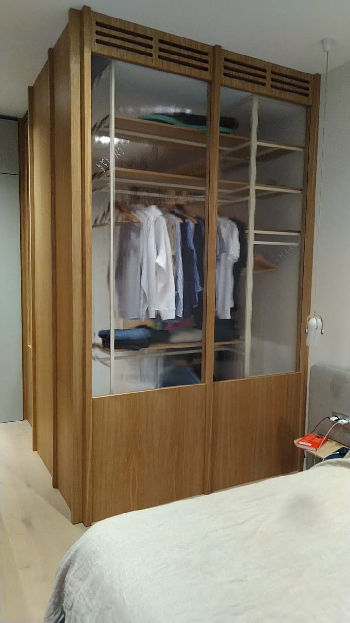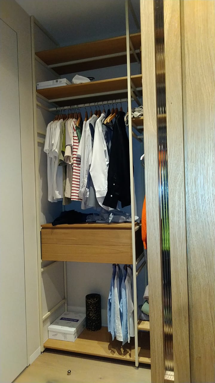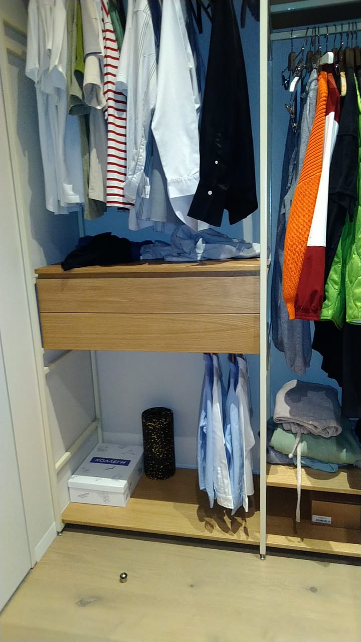 В модели предусмотрены вместительный шкаф для одежды, серия открытых полок для обуви, компактный комод и зеркало в классическом исполнении. Все элементы рационально объединены в единую композицию, что помогает организовать порядок даже в небольших пространствах.