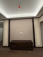Скрытая LED-подсветка создаёт мягкое свечение вокруг панели и добавляет глубину. Такое решение делает ТВ-зону главным акцентом комнаты и помогает комфортно смотреть фильмы вечером без лишней нагрузки на глаза.