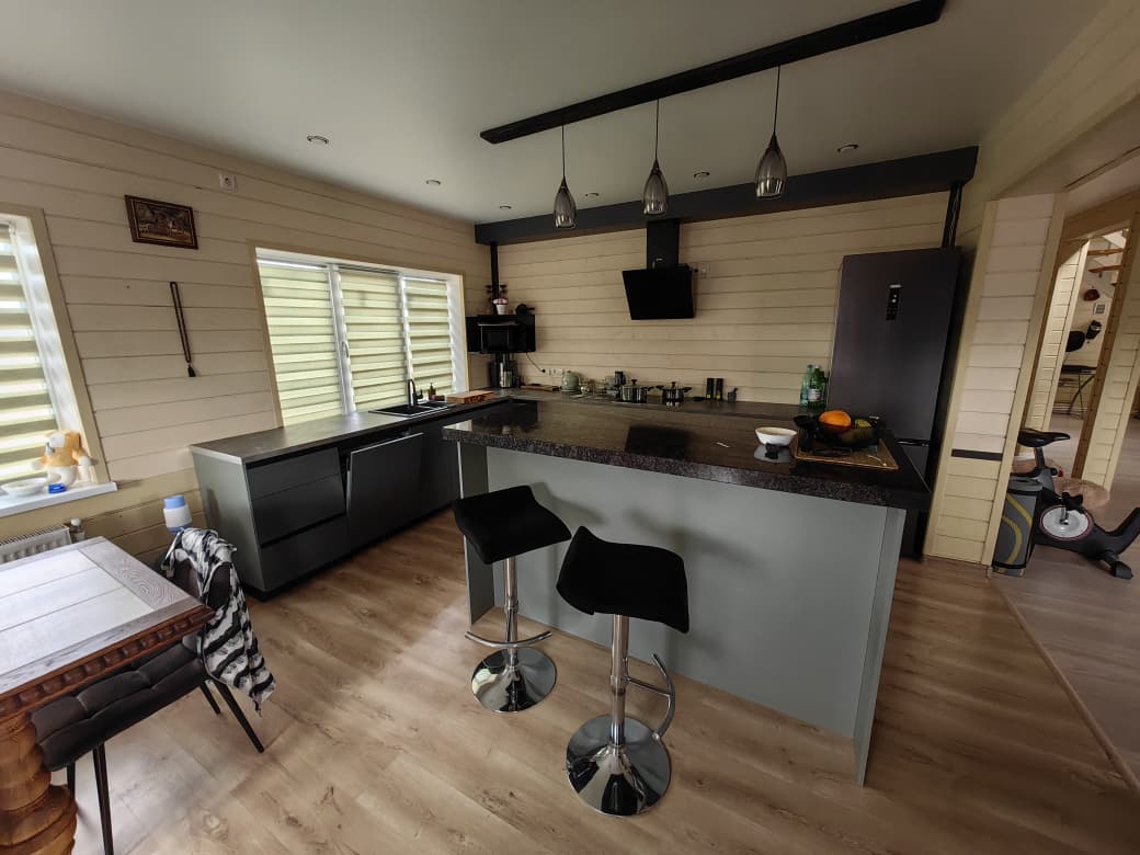 Интегрированная барная стойка делает кухню не только местом для готовки, но и уютной зоной общения. Здесь можно устроить быстрый завтрак, семейные посиделки или встречу с друзьями без необходимости перемещаться в другую комнату. Барная зона оснащена удобными посадочными местами и эргономично расположена для максимального комфорта.