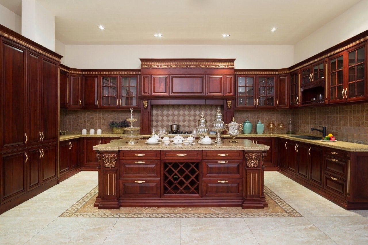 Насыщенный древесный тон, витринные секции и аккуратный декор создают тёплую атмосферу и подчёркивают статус интерьера. Такая кухня гармонично смотрится в классических и неоклассических пространствах и остаётся актуальной на долгие годы.